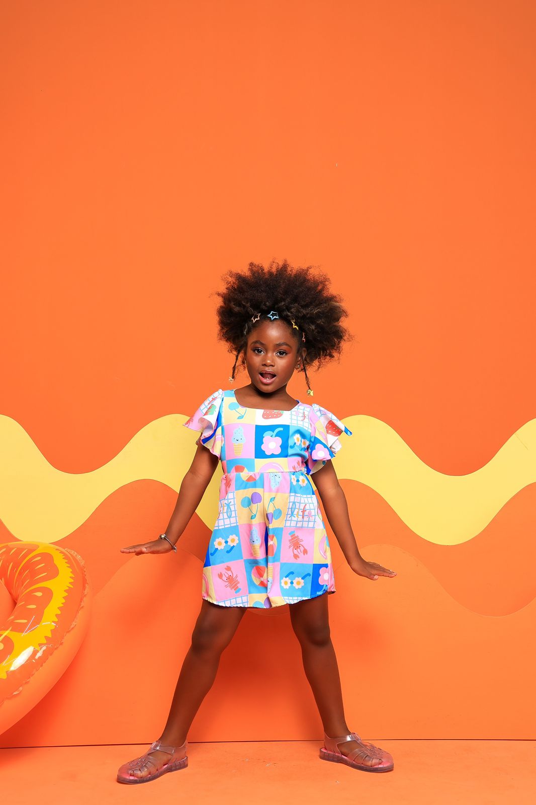 O Macaquinho Pop Kids é a tradução da moda moderna para pequenas que amam se expressar através das cores! Com uma estampa autoral em formato de blocos (color block), ele mistura elementos icônicos do universo infantil — como sorvetes, flores e frutinhas — em uma composição geométrica vibrante e única.